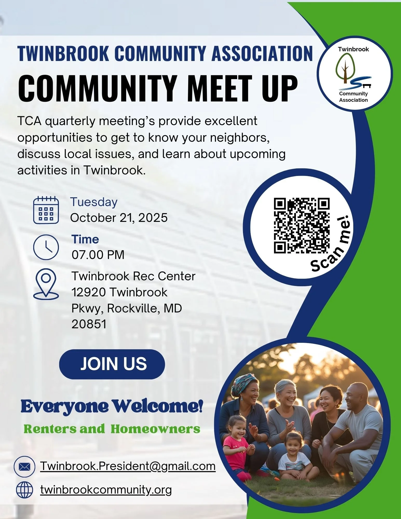 October 21, 2025 TCA Meeting Agenda Agenda to come. Twinbrook Community Association hosts it’s fall meeting on October 21, 2025 at 7:00 PM. Taking place at the Twinbrook Community Recreation Center. Jen HawseAugust 26, 2025Comment Facebook0 Twitter Tumblr Pinterest0 0 Likes